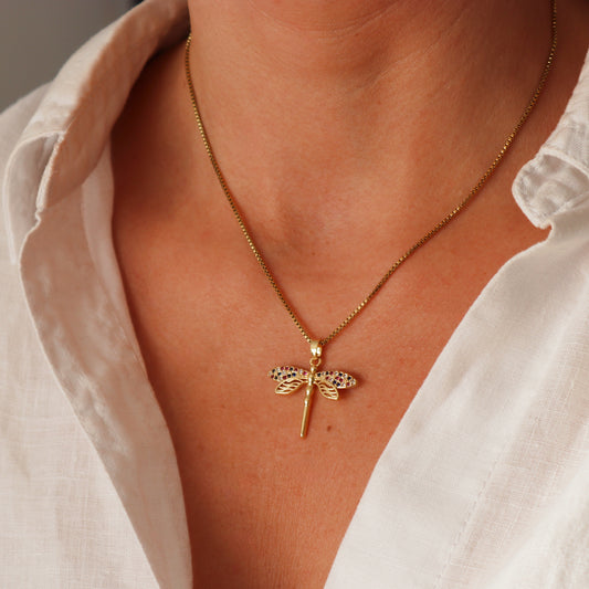 COLLAR GALATEA. Collar de acero inoxidable recubierto de titanio bañado en oro de 18k y colgante con forma de libélula con detalles de circonitas