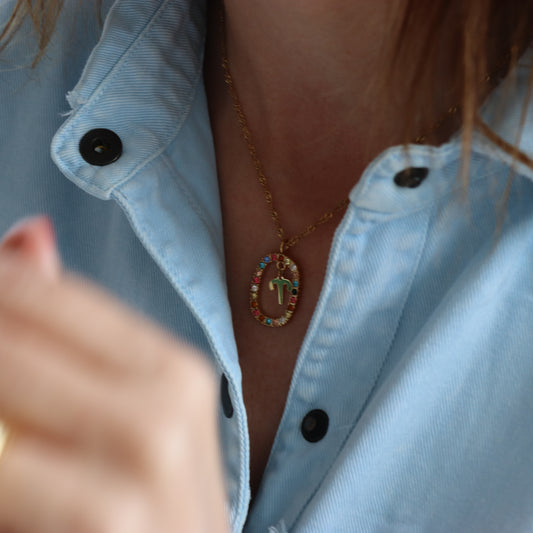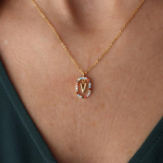 COLLAR IRIS LETRA PERSONALIZADA. Collar de plata de ley 925 bañado en oro de 18k con circonitas multicolor