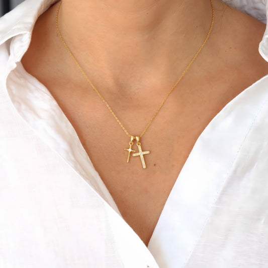 COLLAR MAGDALENA. Collar de plata de ley 925 bañada en oro con colgantes en forma de cruz rellenas de circonitas