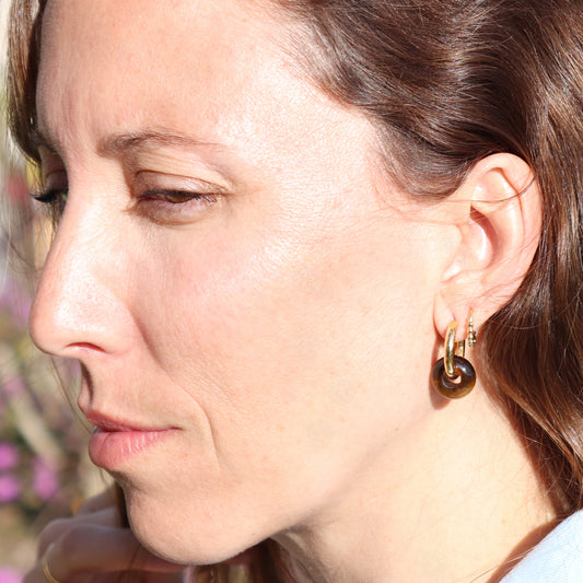 PENDIENTES PIA. Aros de cobre bañados en oro de 18k y colgante de piedra natural marrón