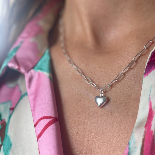 COLLAR DANA. Collar de eslabones de cobre bañado en plata con colgante de corazón