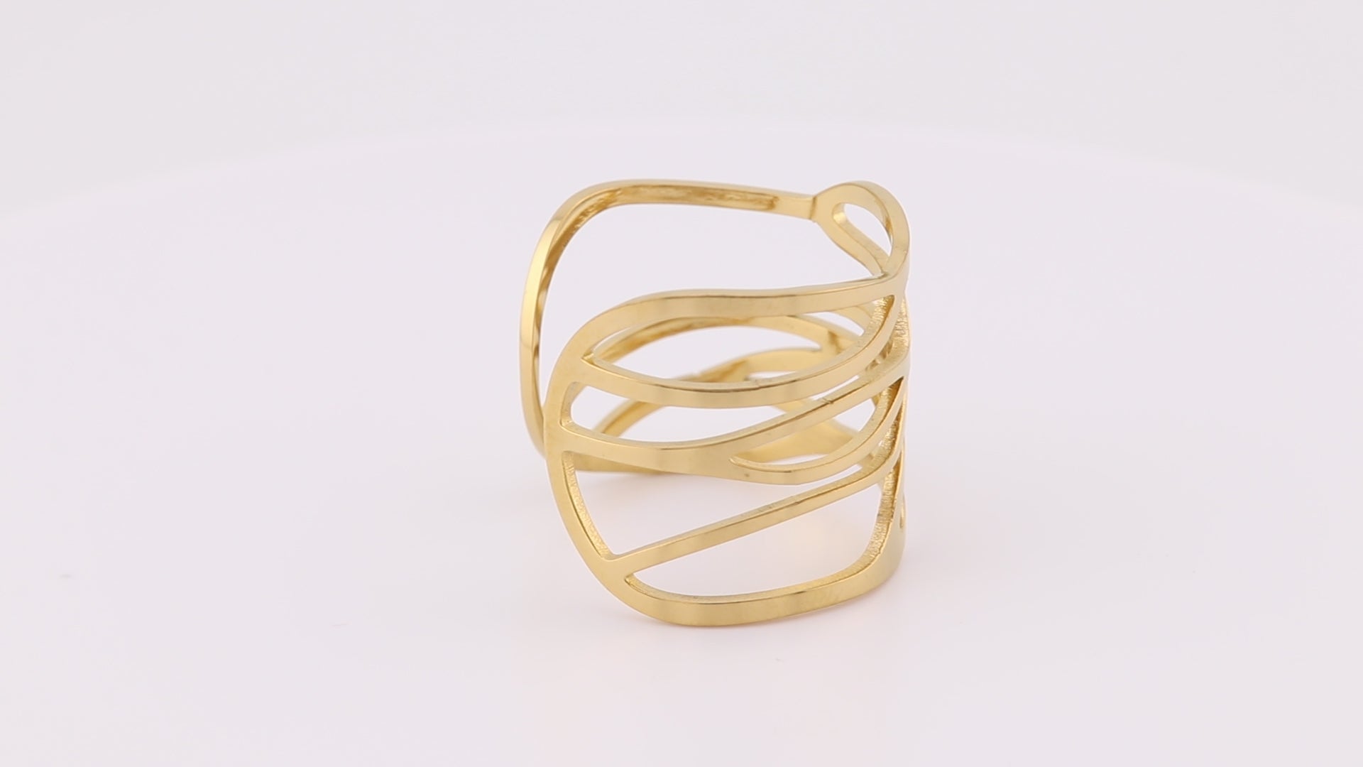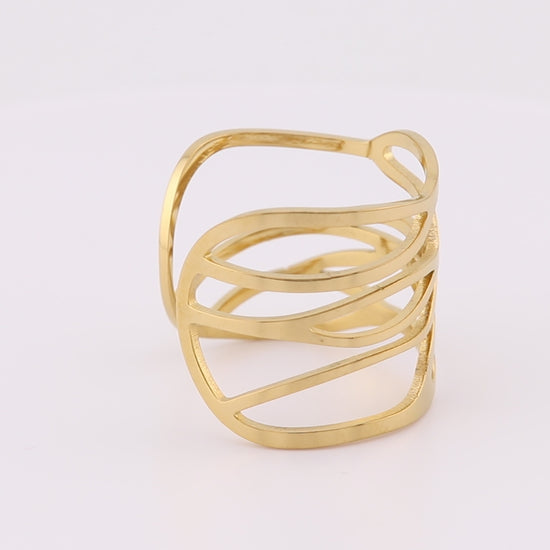 El Anillo Talía es una pieza moderna y elegante, perfecta para quienes buscan destacar con un diseño único. Fabricado en acero de alta calidad y bañado en oro de 14K, este anillo presenta un patrón de líneas onduladas que evocan movimiento y sofisticación. Su estructura abierta y estilizada lo convierte en una joya ligera y cómoda de llevar, ideal para cualquier ocasión. El Anillo Talía es la elección perfecta para añadir un toque de glamour contemporáneo a tu colección de joyas.